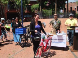 Mellody Mallick wins a prize for her “Best Commuter Bike,” as selected by audience applause. See our humbike.org website for many other photos from Bike Month events.